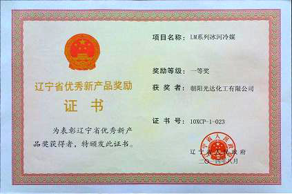 朝陽(yáng)光達(dá)化工有限公司研發(fā)生產(chǎn)的專(zhuān)利產(chǎn)品—LM系列冰河冷媒榮獲遼寧省優(yōu)秀新產(chǎn)品!