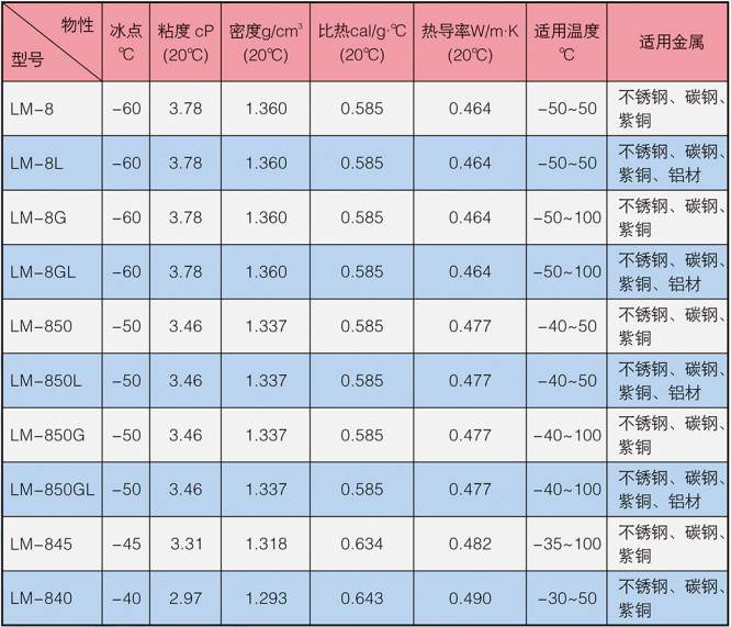 LM-8系列冰河冷媒由改性有機酸鹽構(gòu)成,主要添加劑包括防腐蝕劑,防霉劑,增溶劑,穩(wěn)定劑等。外觀為淺色液體,沸點高于105℃,不易揮發(fā),無閃點,不可燃,低毒。