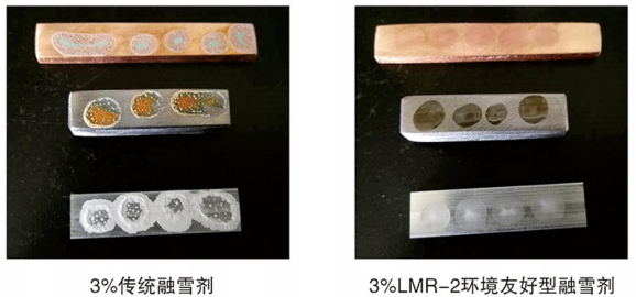 3、防腐蝕性能好,采用M3超膜防銹技術,對碳鋼、銅、鋁合金等金屬幾乎不腐蝕:對瀝青、混凝土路面腐蝕較小。LMR-2融雪劑防銹性能見下圖。