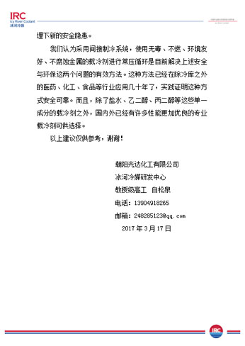 以上是我公司對《設計規(guī)范》提出的意見,同時也需要同行們的監(jiān)督和幫助,歡迎廣大冷庫業(yè)主,工程商,上下游企業(yè)來電咨詢冰河冷媒載冷劑制冷系統(tǒng)!