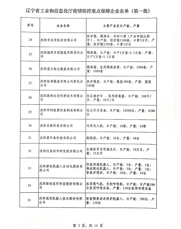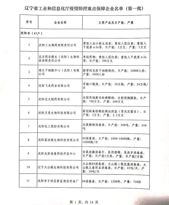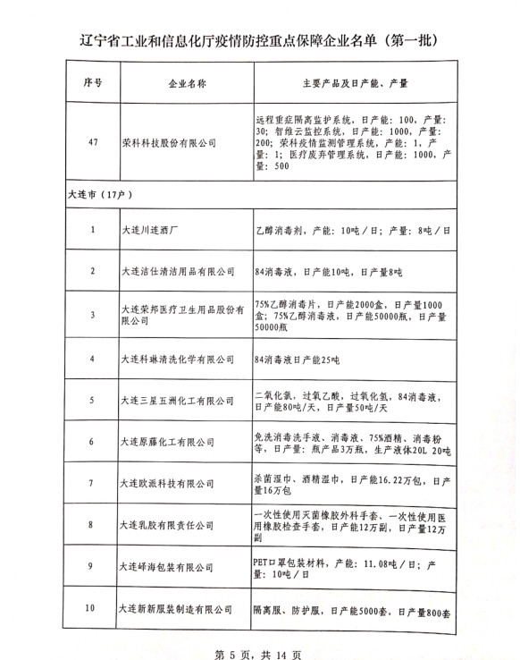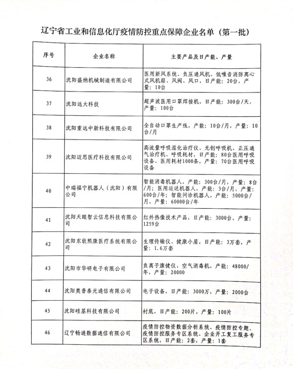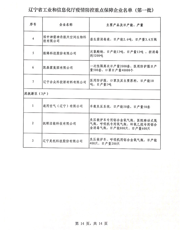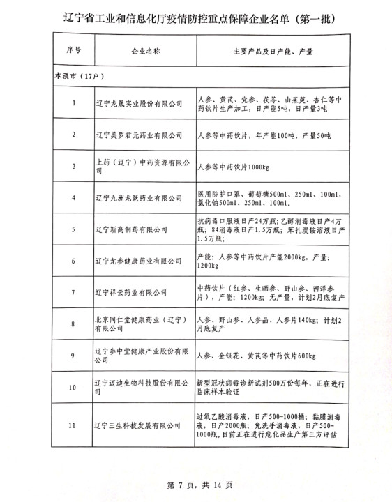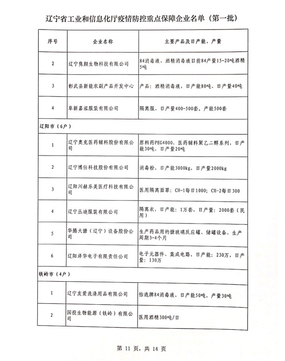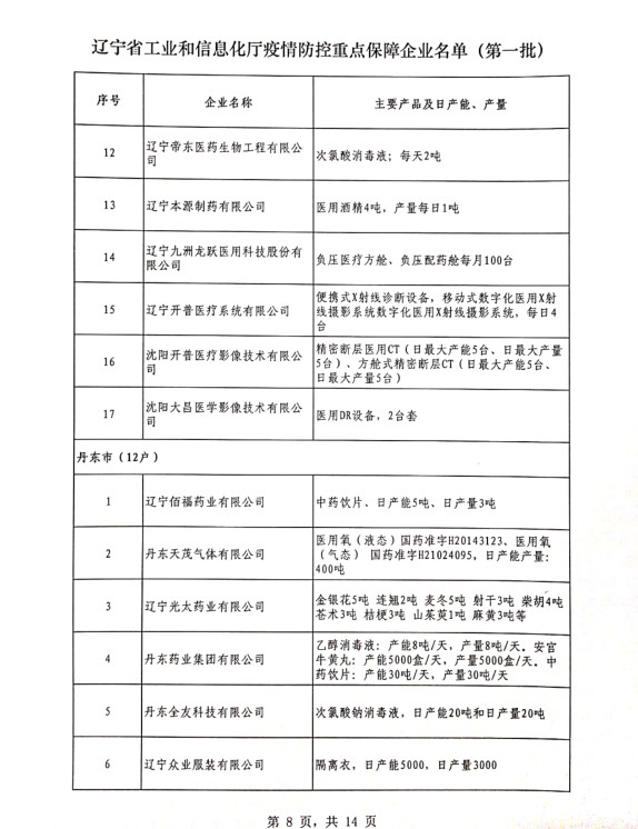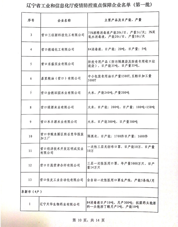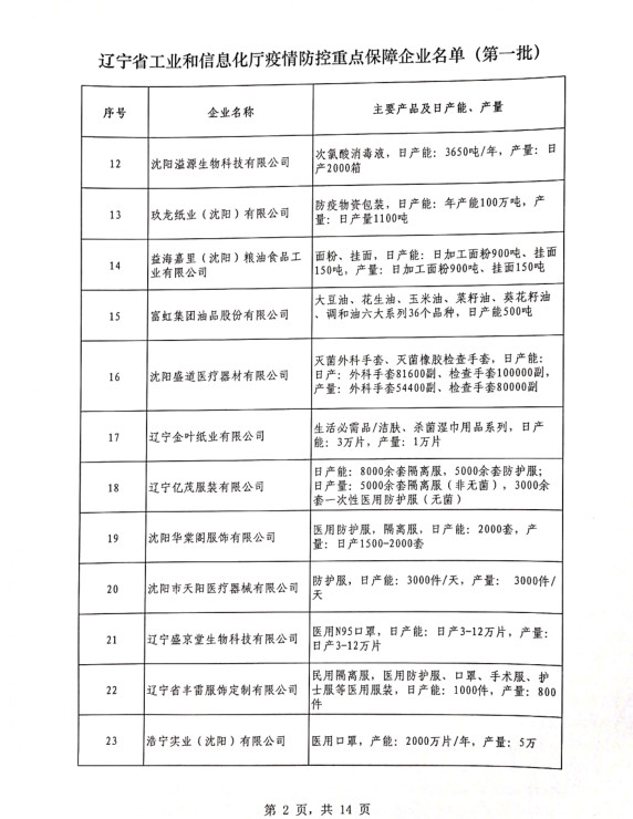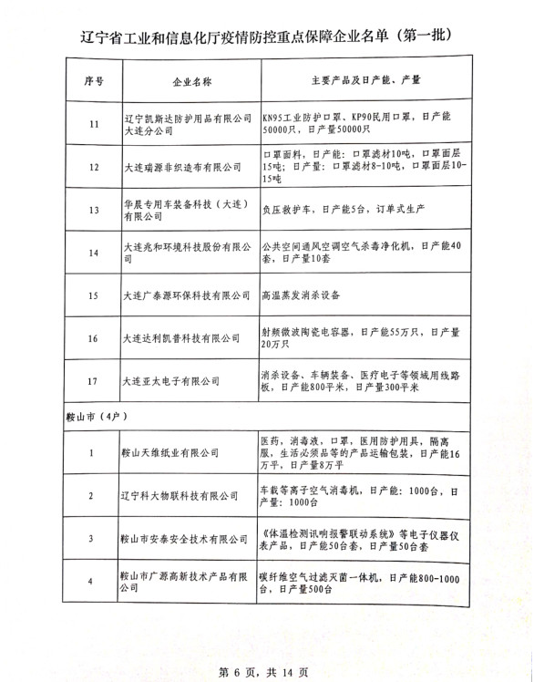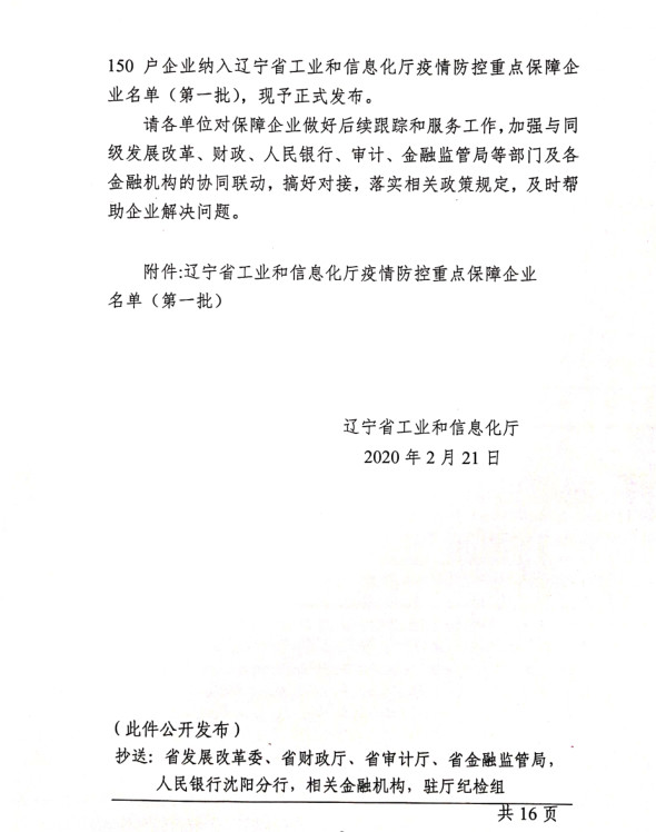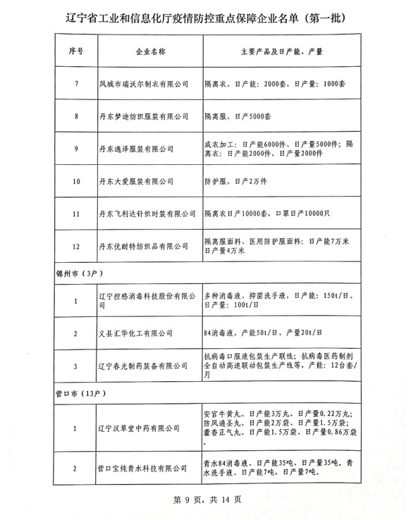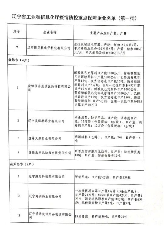 為貫徹落實(shí)習(xí)近平總書(shū)記關(guān)于疫情防控工作的重要講話和指示批示精神,落實(shí)黨中央、國(guó)務(wù)院和省委、省政府有關(guān)部署,按照《遼寧省人民政府關(guān)于印發(fā)遼寧省應(yīng)對(duì)新型冠狀病毒感染的肺炎疫情支持中小企業(yè)生產(chǎn)經(jīng)營(yíng)若干政策措施的通知》(遼政發(fā)【2020】6號(hào))和《遼寧省工業(yè)和信息化廳關(guān)于規(guī)范省級(jí)疫情防控重點(diǎn)保障企業(yè)名單管理有關(guān)事項(xiàng)的通知》(遼工信明電【2020】35號(hào))要求,在各市審核推薦的基礎(chǔ)上,經(jīng)我廳認(rèn)真研究,決定以下150戶企業(yè)納入遼寧省工業(yè)和信息化廳疫情防控重點(diǎn)保障企業(yè)名單(第一批)。